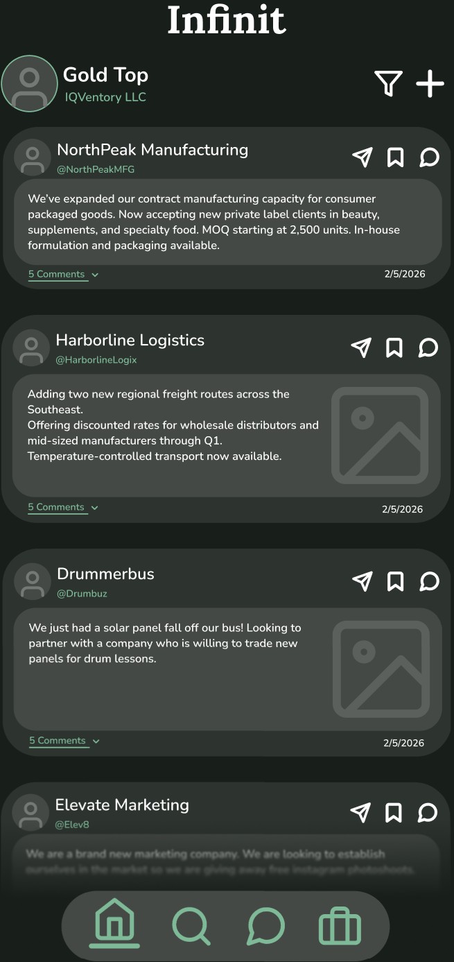 See what businesses in your network are up to. New product drops, open collaborations, partnership asks — all in one scroll. Follow who matters to you and skip the noise.